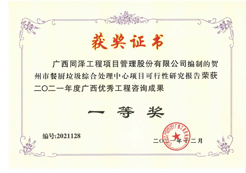 賀州市餐廚垃圾綜合處理中心項(xiàng)目榮獲2021年度廣西優(yōu)秀工程咨詢成果一等獎
