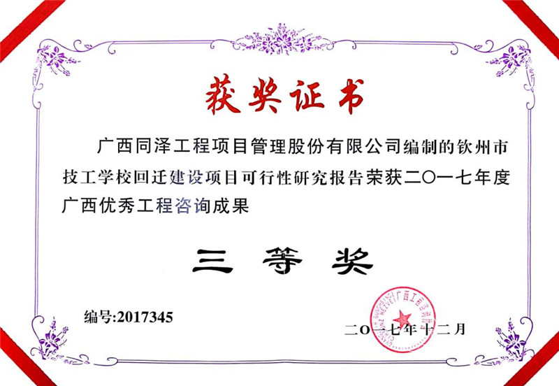 欽州市技工學(xué)校回遷建設(shè)項(xiàng)目可行性研究報(bào)告榮獲2017年度廣西優(yōu)秀工程咨詢(xún)成果三等獎(jiǎng)