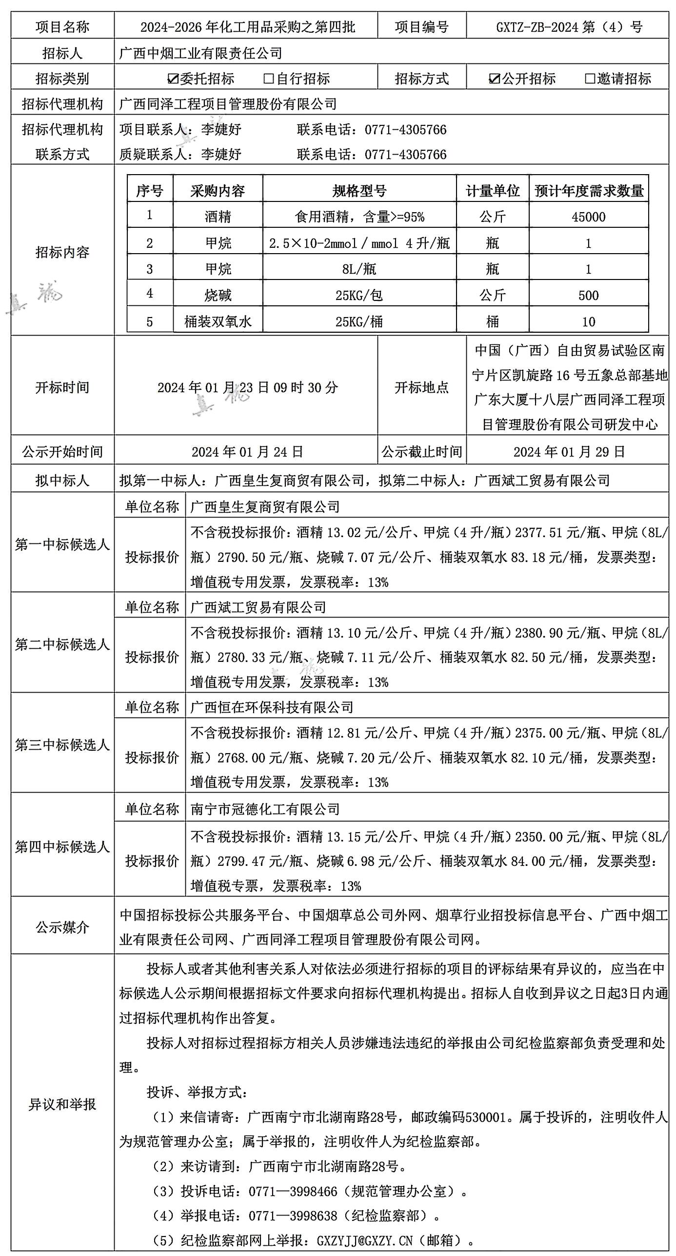 廣西中煙工業(yè)有限責(zé)任公司2024-2026年化工用品采購(gòu)之第四批(項(xiàng)目編號(hào):GXTZ-ZB-2024第(4)號(hào))中標(biāo)候選人公示